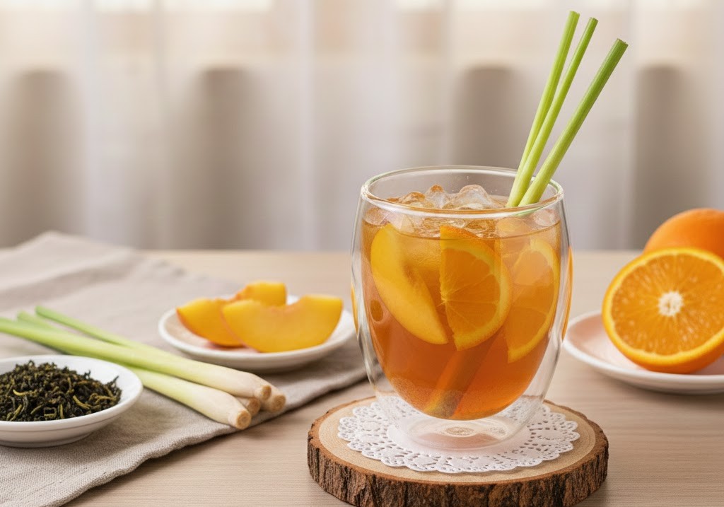 Đây là công thức cho thấy rõ khả năng “nâng đỡ hương vị” của chè Thái Nguyên khi đi cùng trái cây và thảo mộc một cách hài hòa. Trà đào cam sả là thức uống quen thuộc ngoài tiệm, nhưng khi làm tại nhà với chè Thái Nguyên, hương vị sẽ tinh tế hơn nhiều.