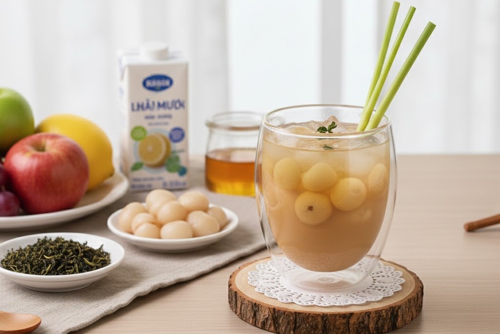 Vải hoặc nhãn nên chọn loại tươi, bỏ hạt, nấu nhanh với chút đường phèn để tạo nước quả nhẹ. Chè Thái Nguyên pha riêng, để nguội rồi hòa cùng nước vải.